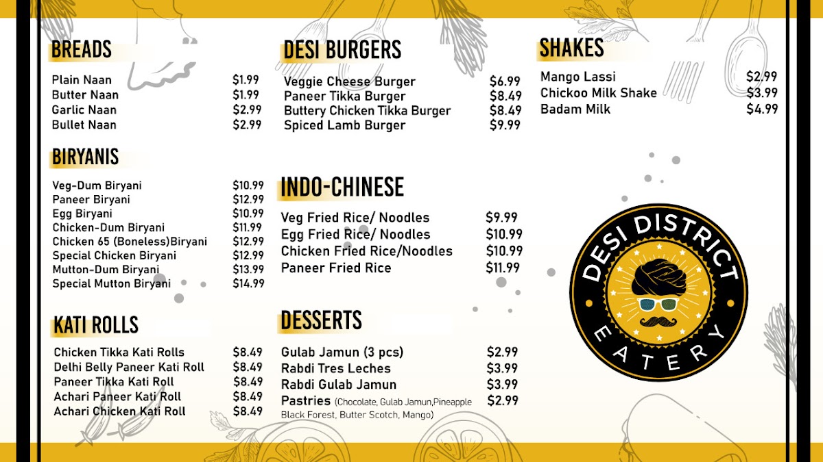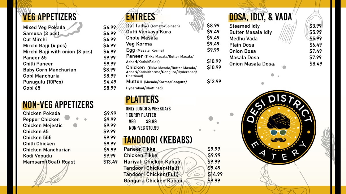 For those seeking a hearty meal, the Malai Paneer Kebab and the indulgent Vijayawada Chicken Biryani provide sumptuous options for any appetite. Desi District also features a well-curated grocery section for essential Indian snacks, creating a unique blend of dining and shopping. Customers rave about the friendly, attentive service and the inviting ambiance, making it an ideal spot for casual hangouts or quick bites. Immerse yourself in a culinary journey that captures the essence of Indian street food and culinary tradition—visit Desi District today!